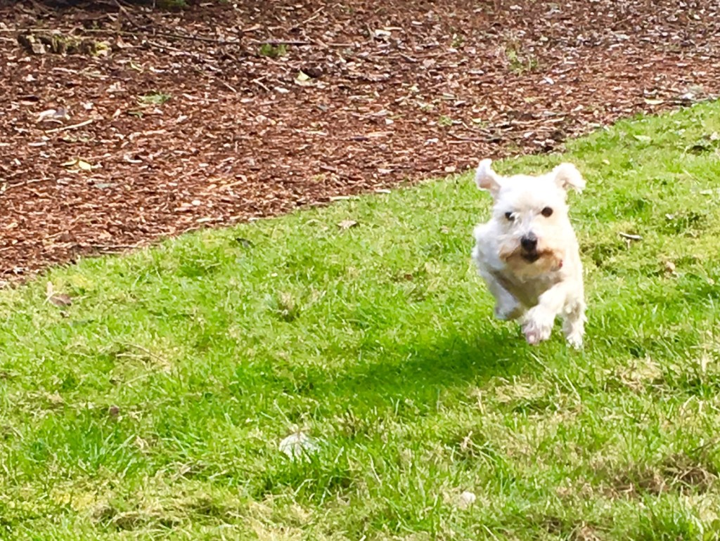 I started working on recall with Ada on a long-line. She gradually got better and better at coming when called. Finally, when her recalls were looking quite good, I decided to take the plunge and let her spend a bit of time off-leash. I had found a long, huge, fenced-in area. I unsnapped her leash. Ada took off running at approximately the speed of light. I called “Ada, Come!” several times to no avail. I watched her little furry rear disappear into the distance and hoped fervently that there weren’t any holes in the fence. Finally, Ada hit the fence, stopped, and decided to come back. Needless to say, we worked on her recall on leash for quite a bit longer before I opted to unhook her leash again.